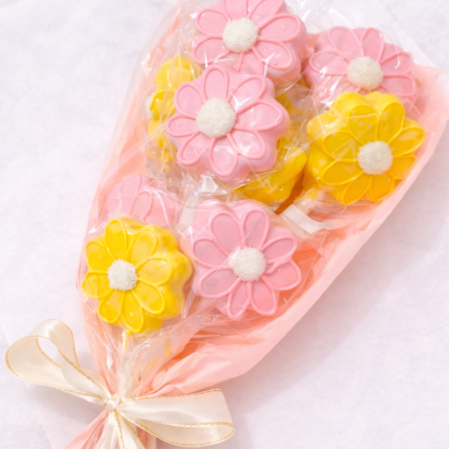 A sweet, gift-ready bouquet of cake pops, designed to look like soft spring blooms. The perfect treat to celebrate Mom this Mother's Day.